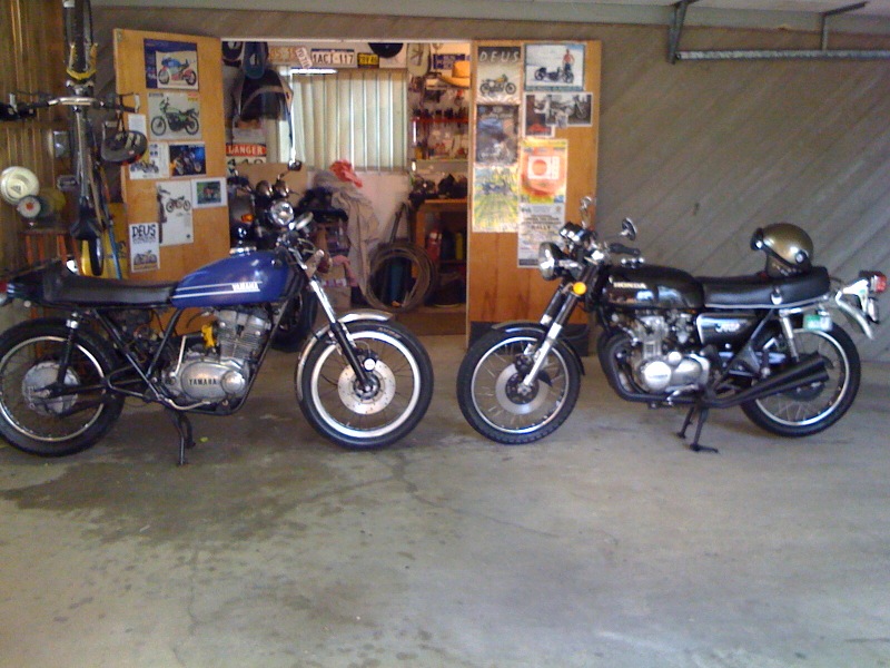 Left to Right: Suzuki T20, 1979 Yamaha RD400 Daytona, Steves CB350F