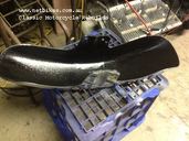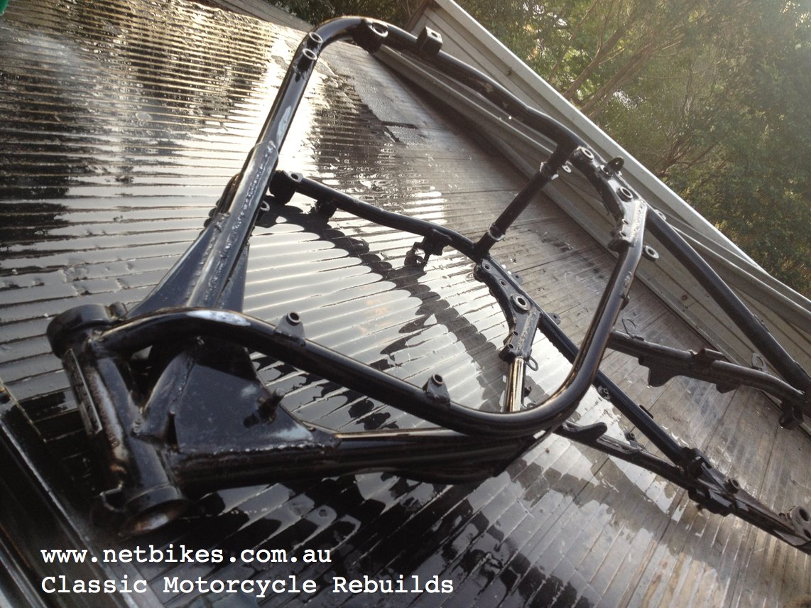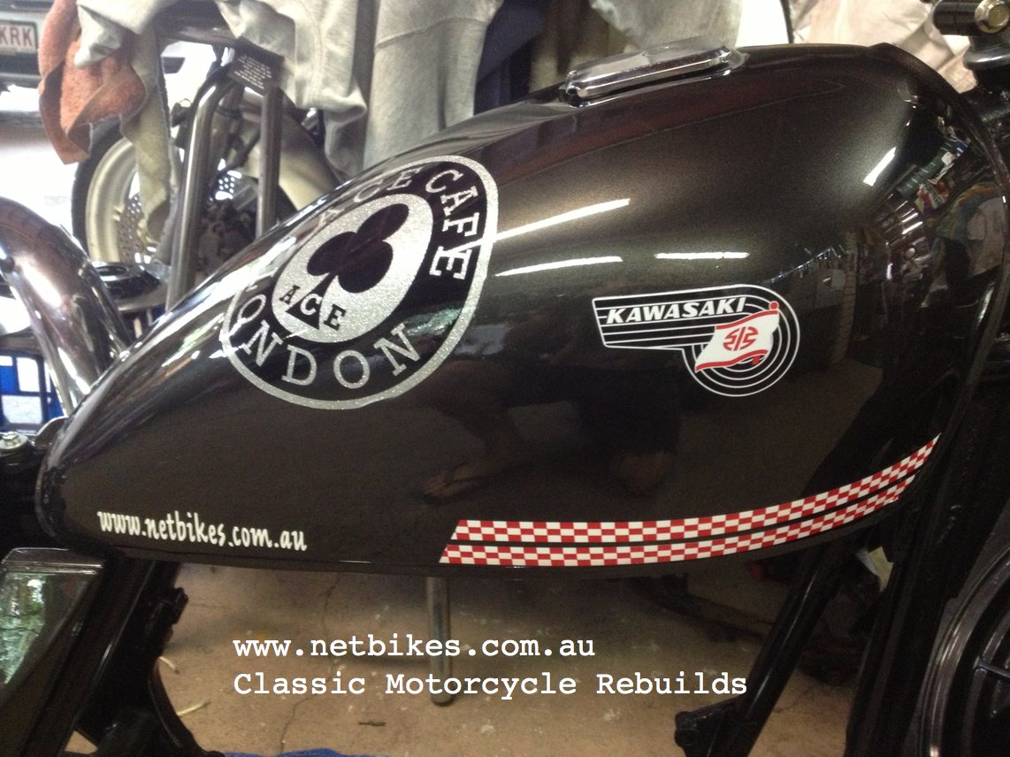 Motor HAS NOT been stripped, it was in good running order before restoration began. I did remove the top cover to inspect cams etc and all was in order as expected by its good running condition. New oil and a new filter were fitted. Externally the motor was cleand, primed and painted in VHT heat proof, also I did lots of alloy polishing as you can see in the pictures. Bike was otherwise stripped to the ground, frame and all other black parts were sanded smooth the primed and top coated with Wurth gloss paint. Both wheels were stripped of bearings etc and painter by Buddahs at Slacks Creek, I then fitted new bearings fitted to both along with new tyres. All other grey paint was also done at Buddahs, the decal designs were my thoughts and have been clear coated over. Front forks were stripped, lowers polished by me, new oil and fork seals fitted. The triple tree also have new bearings. Front mastercylinder is new, the line is also new, Braided from Hel in Brisbane. The rear shock absorbers are new from Tecshock The chain guard and rear brake pedal are powder coated. New clutch speedo and tacho cable, new chain All threads were newly zinc coated by Wally Williams in Toowoomba. Carbs were fully stripped and cleaned internally and extrenally, brand new diapharms were fitted. I fitted a complete brand new starter clutch assemble, not just a kit. The wiring harness was basically rebuilt with lots of new correct plug ends and correct outer tape. I trimmed the original seat foam down somewhat and had it recovered. A new Oring drive chain is fitted, the sprockets are in good conditin and were not renewed. New rear brake linings are fitted. New brown hand grips fitted. I bought these from a seller in Italy. |
