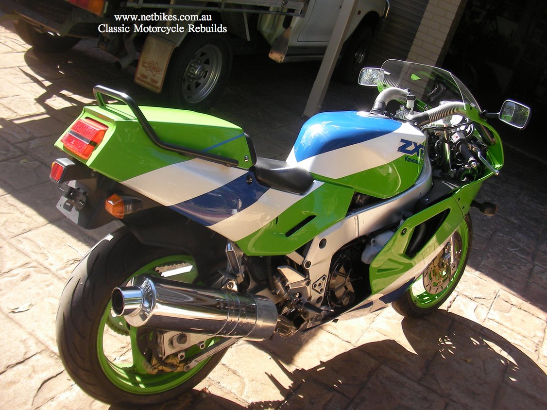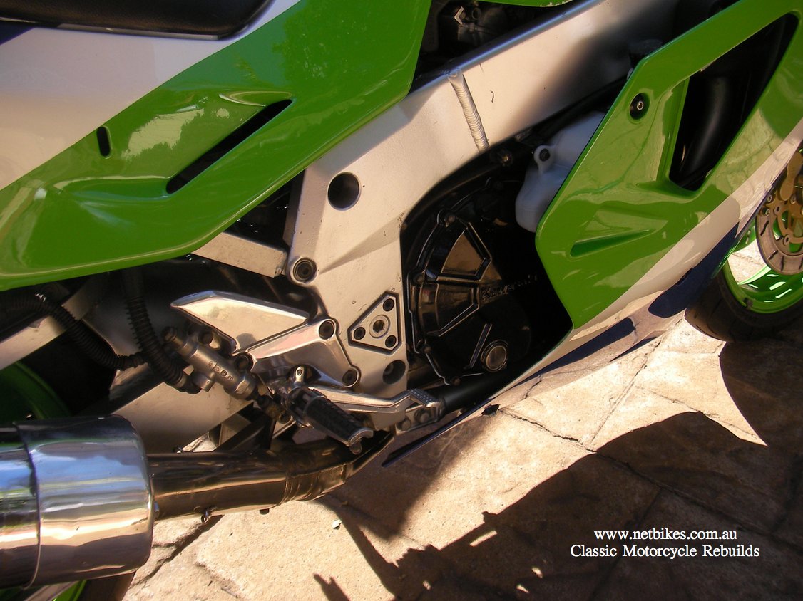 | Almost done now, need to buy a screen, a couple more rubber bits for under the tank, a better muffler and sort the decals out, think that's about it. It's looking good, well to me anyway:-). There are still some other minor details to fix, like touch up the very lower line of the tank and some marks on the frame, find that little rubber cover for the right hand air hose clamp, so please, if you have one in your shed you know who can use it, and don't all those little things cost a buck or two, I have replaced almost all the rubber fairing inserts, small screws, clips etc etc with new genuine in sealed packets Kawasaki parts at a cost of almost $300.00. |